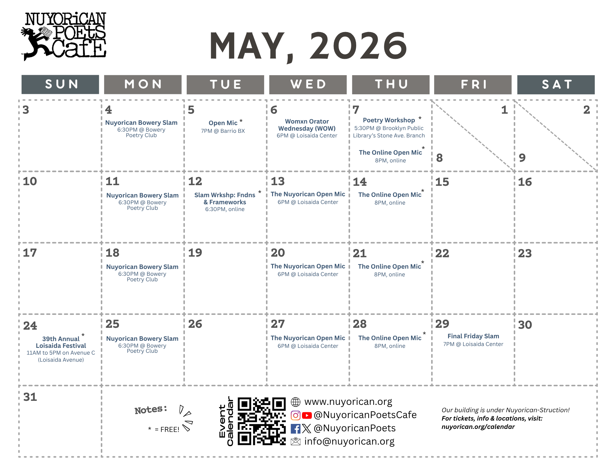 Our classic, printed calendar - our events taking place off-site and online in May 2026. Or click here to access our ticket site for all current-month & upcoming events/months and to purchase tickets.