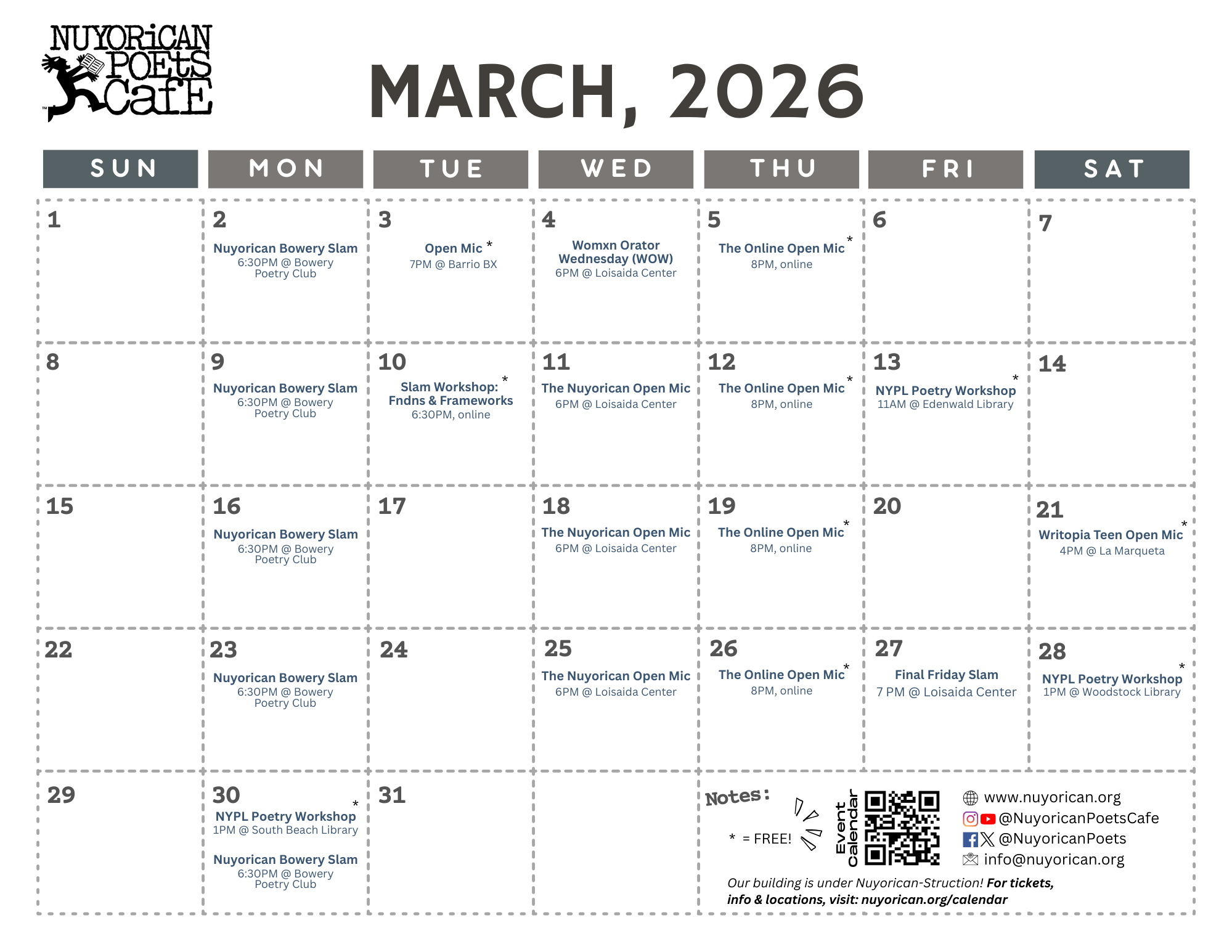 Our classic, printed calendar - our events taking place off-site and online in March 2026. Or click here to access our ticket site for all upcoming events/months and to purchase tickets.